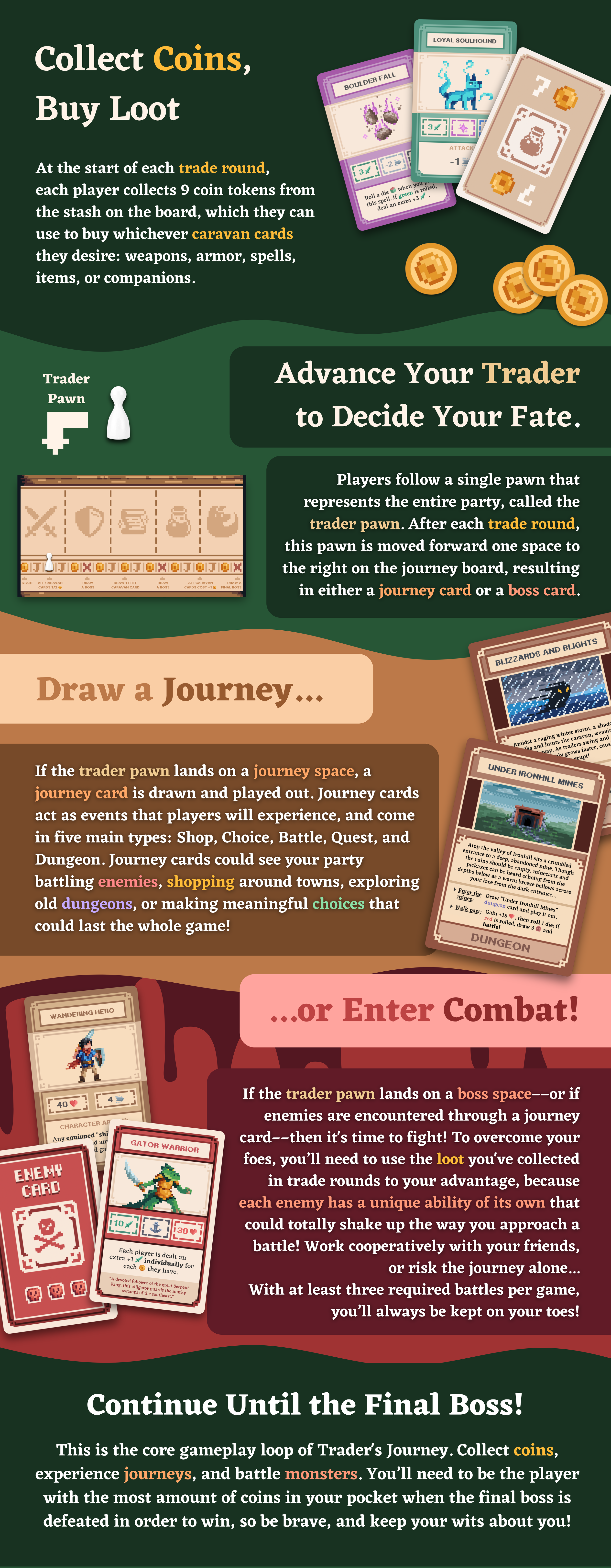 With an easy-to-learn and malleable ruleset, Trader’s Journey can be modified to fit almost anyone’s preferences, whether you’d like to make the game a bit easier by drawing more coins each turn, harder by drawing more enemies, or shorter by lowering the amount of trade rounds, the possibilities are endless!